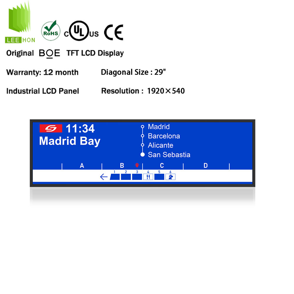 Bar LCDs are widely used in buses, metro systems, and trains for displaying route information, advertisements, and passenger guidance.